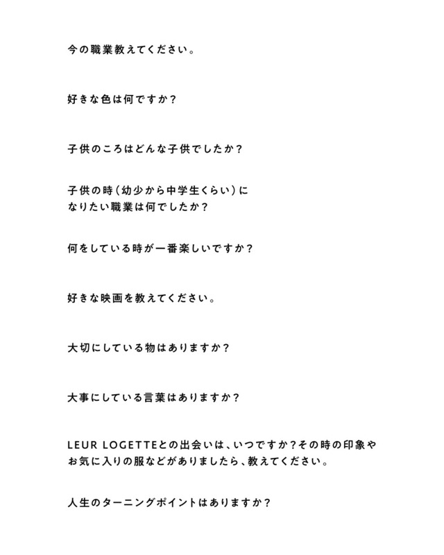 “8 Women, 8 Voices” 3woman ✴︎会期終了後、金余青葉氏からご発送いたします。 ✴︎発送元(金森青葉氏)に納品先を共有させていただきます。 ✴︎「クリックポスト・宅急便」をお選びください。 voice3 ✴︎今の職業教えてください。 →スタイリストマネージャー ✴︎好きな色は何ですか? →ピンク ✴︎子供のころはどんな子供でしたか? →やる気があるのか無いのかわからない子供 ✴︎子供の時(幼少から中学生くらい)になりたい職業は何でしたか? →少女漫画の影響で薬剤師 ✴︎何をしている時が一番楽しいですか? →しなくてはならないことが無い時 ✴︎好きな映画を教えてください。 →イン・アメリカ ✴︎大切にしている物はありますか? →あります→ 枕元のぬいぐるみ ✴︎大事にしている言葉はありますか? →あります→表裏一体、陰陽 ✴︎LEUR LOGETTEとの出会いは、いつですか?その時の印象やお気に入りの服などがありましたら、教えてください。 →始まりから。本当に立ち上がったことに尊敬の気持ちで応援して来ました。 お気に入りは色々あるけど白地に花柄のコート ✴︎人生のターニングポイントはありますか? →子供が生まれたこと。自分の選択することが自分だけのことじゃなくなったと感じたから