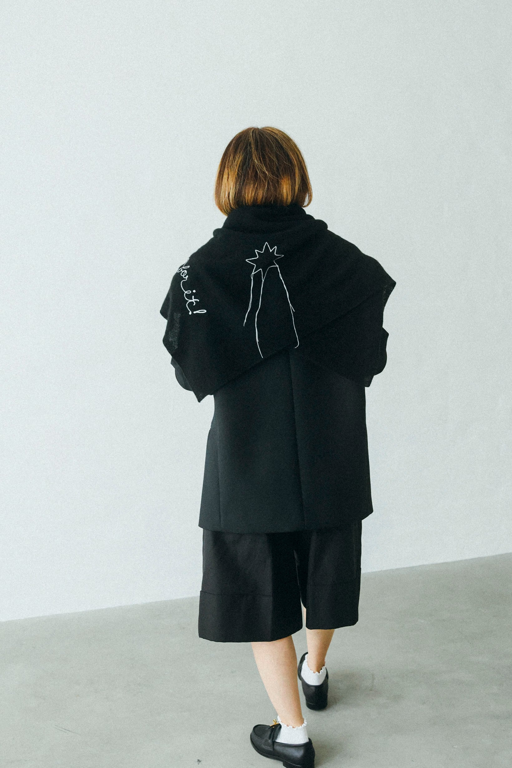 文字の他にどちらにのストールにも「星」のような「小爆発」のようなステッチが入っています。垂れている糸はカットすることもできるのでよりシンプルにしたい方はカットしてみてください。ご注意:刺繍はハンドルミシンによる手刺繍のため個体差がございます。1点ものとしてお楽しみください。