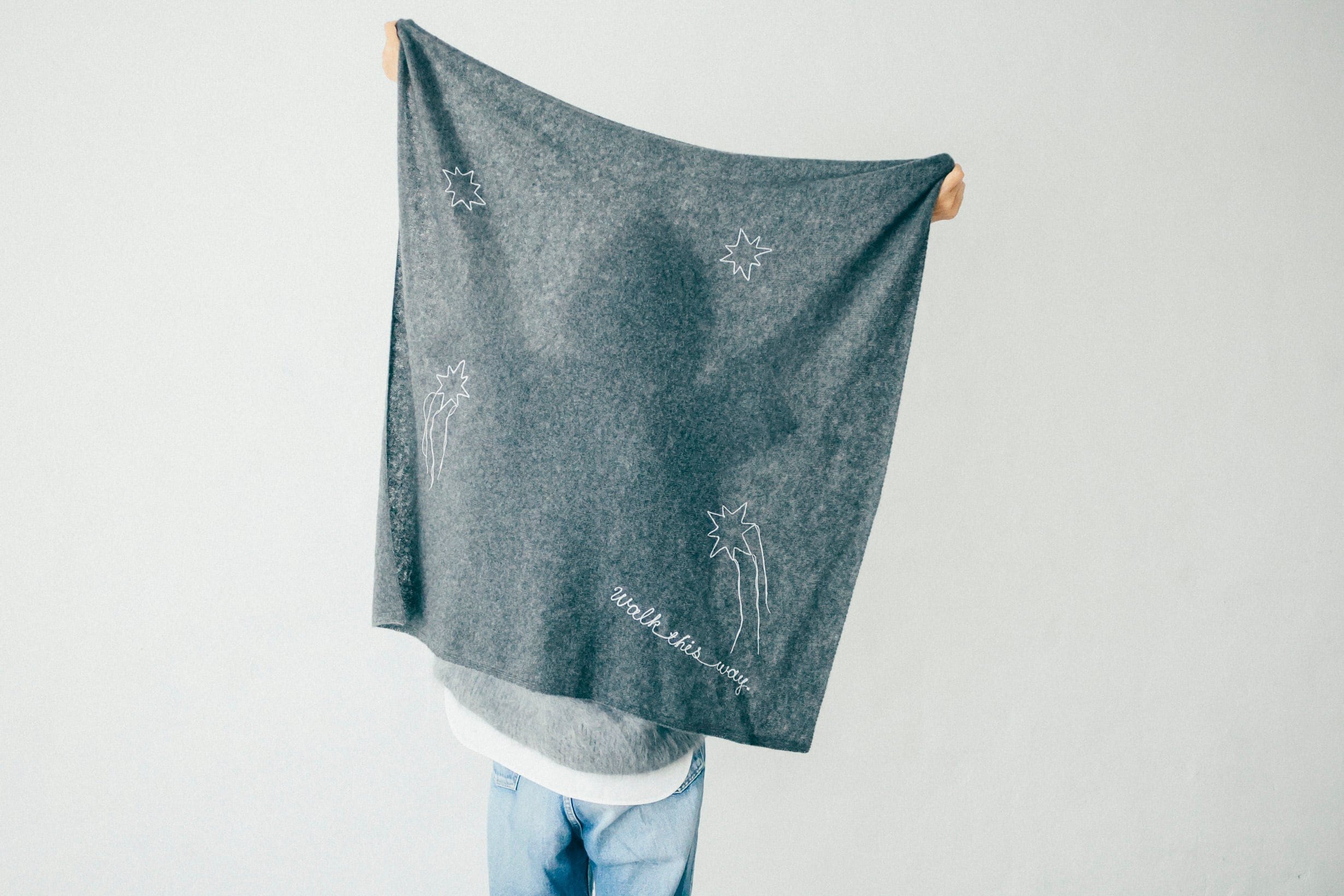 文字の他にどちらにのストールにも「星」のような「小爆発」のようなステッチが入っています。垂れている糸はカットすることもできるのでよりシンプルにしたい方はカットしてみてください。ご注意:刺繍はハンドルミシンによる手刺繍のため個体差がございます。1点ものとしてお楽しみください。