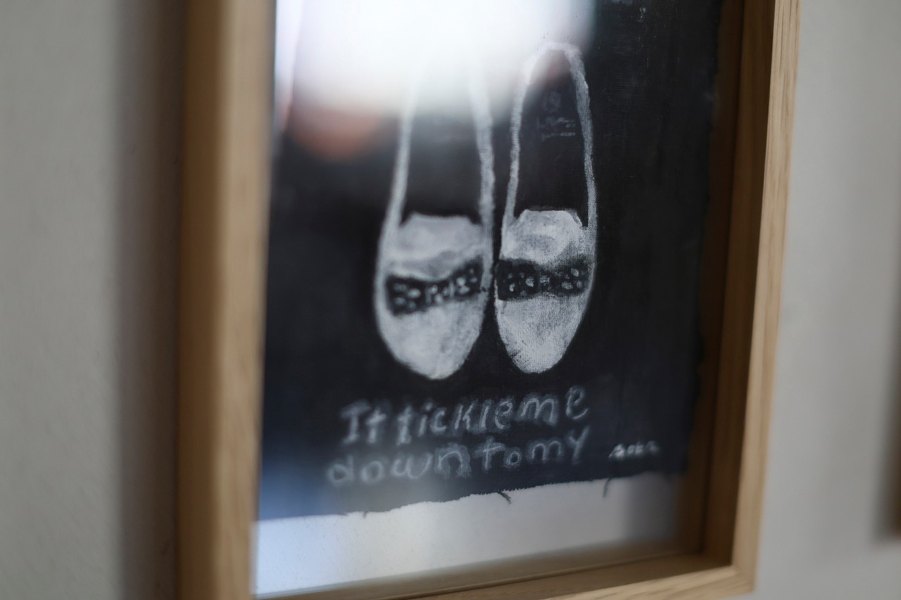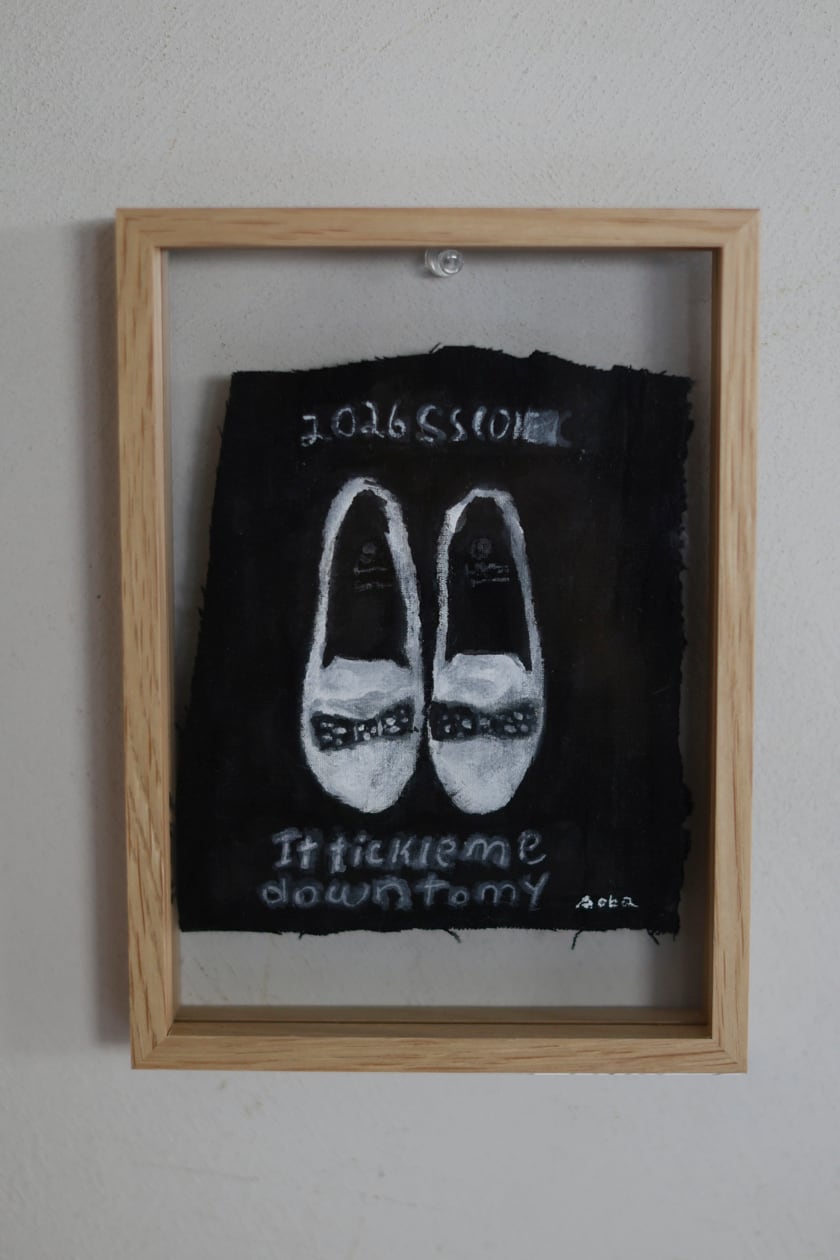 木製のシンプルな額に入ったアートワークです。LEUR LOGETTEさんのブラックの端切れに白い靴。「It tickle me down to my」という青葉氏の文字。down to myの後の言葉が気になりますが、いつも朗らかな青葉さんののんびりとした文字が印象的です。ふと目に入るたびに、少しだけ気分が上向くような、そんな一枚になりますように。
