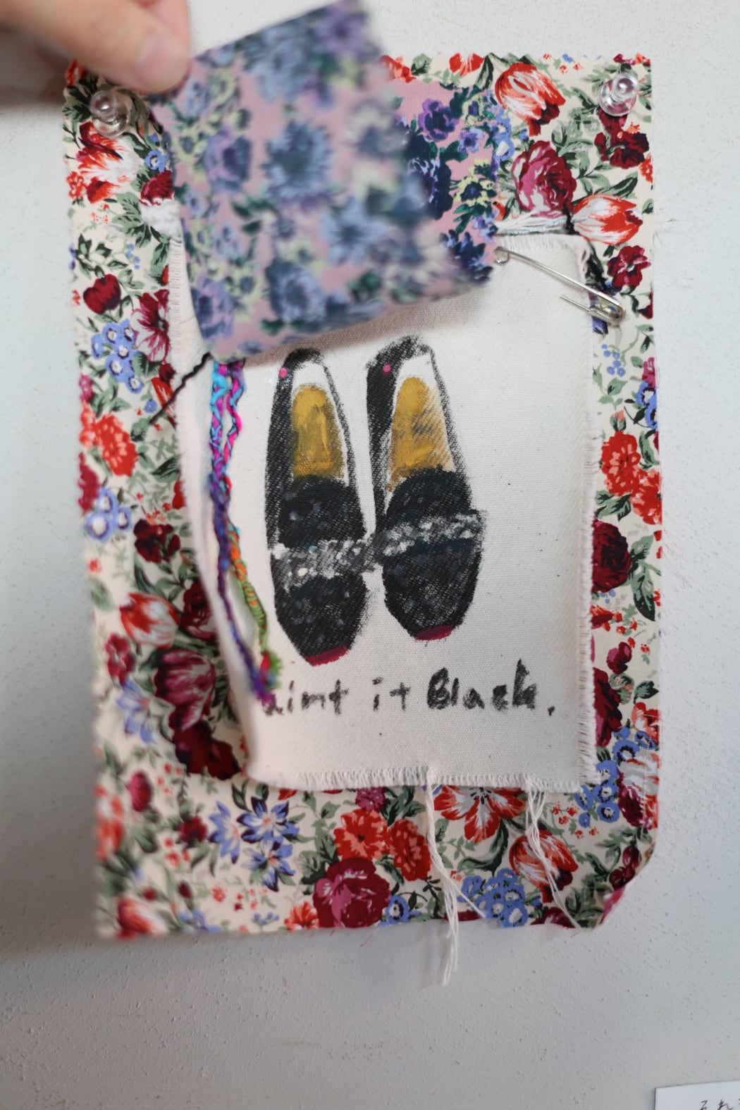 そんな想いを重ねるように、いくつかの端切れを重ねて仕立てたアートワークです。ピンクの生地をそっとめくると、LEUR LOGETTEさんのシューズのイラストが現れます。ぜひ、おうちの壁にピンで留めて、気軽に飾ってお楽しみください。ふと目に入るたびに、少しだけ気分が上向くような、そんな一枚になりますように。